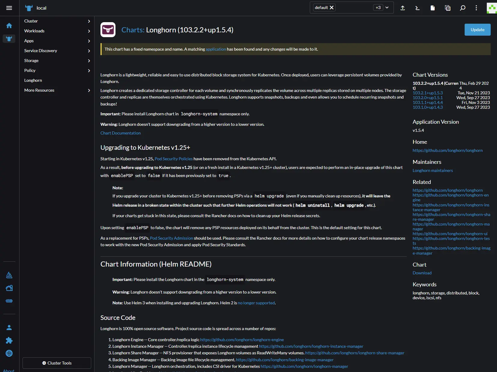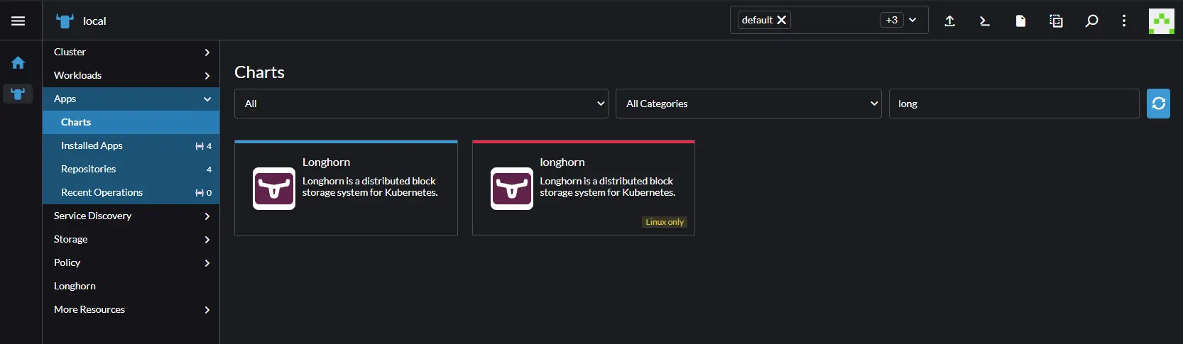 I added an additional chart directly from longhorns helm, however by default the blue longhorn would be the only one that would show up at this point. Click on the longhorn and that will take you to an install screen. Click the install button on the top right