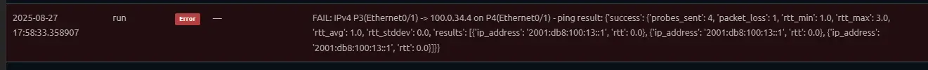 ERROR: FAIL: IPv4 router3(Ethernet2) -> 10.0.1.2 on router4(Ethernet2) - ping result: {'success': {'probes_sent': 3, 'packet_receive': 0, 'packet_loss': 3}}