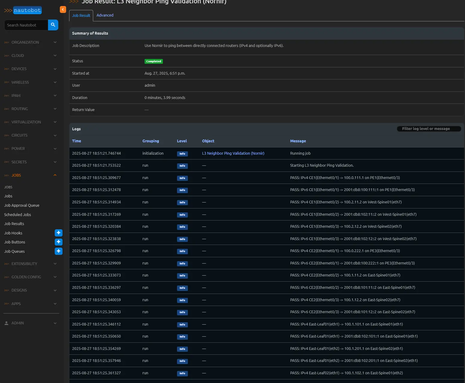 Our example Job, L3NeighborPingValidationNornir, pings between directly connected router interfaces to confirm that IP addresses are configured correctly and that L3 adjacencies are operational.
