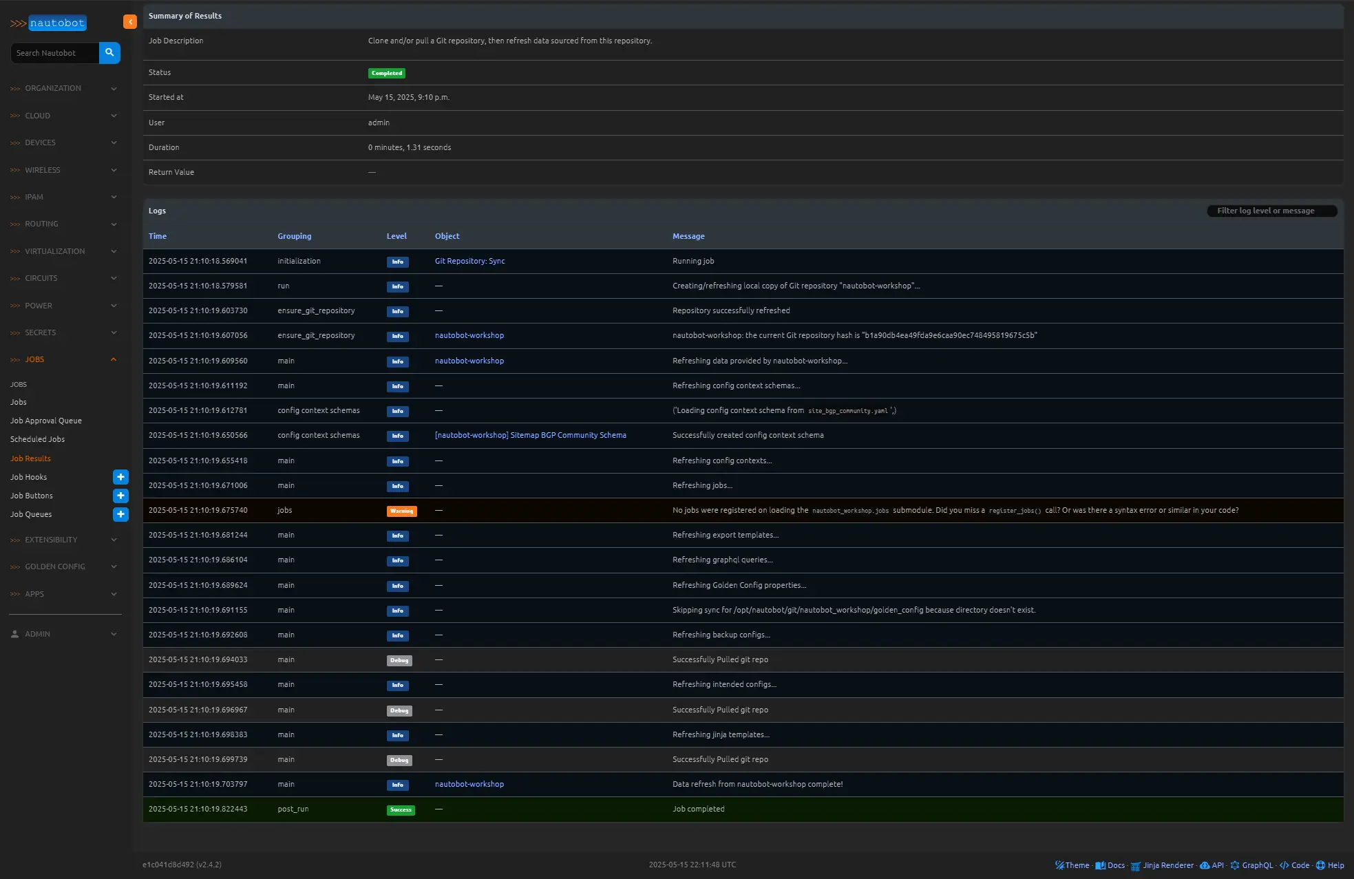 In this part of the Nautobot Workshop, we brought together several powerful capabilities of Nautobot and Ansible to automate the full lifecycle of device configuration. By leveraging Config Contexts and Schemas stored in a Git repository, we created a structured and version-controlled approach to storing device-specific data. Using Nautobotβs GraphQL API and Ansibleβs dynamic inventory plugin, we extracted the data needed to build platform-specific, modular configuration templates using Jinja2.