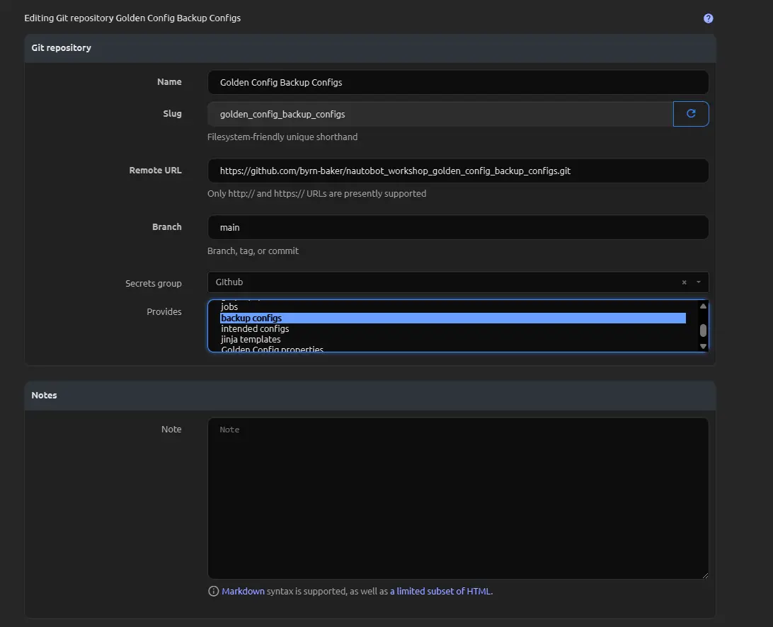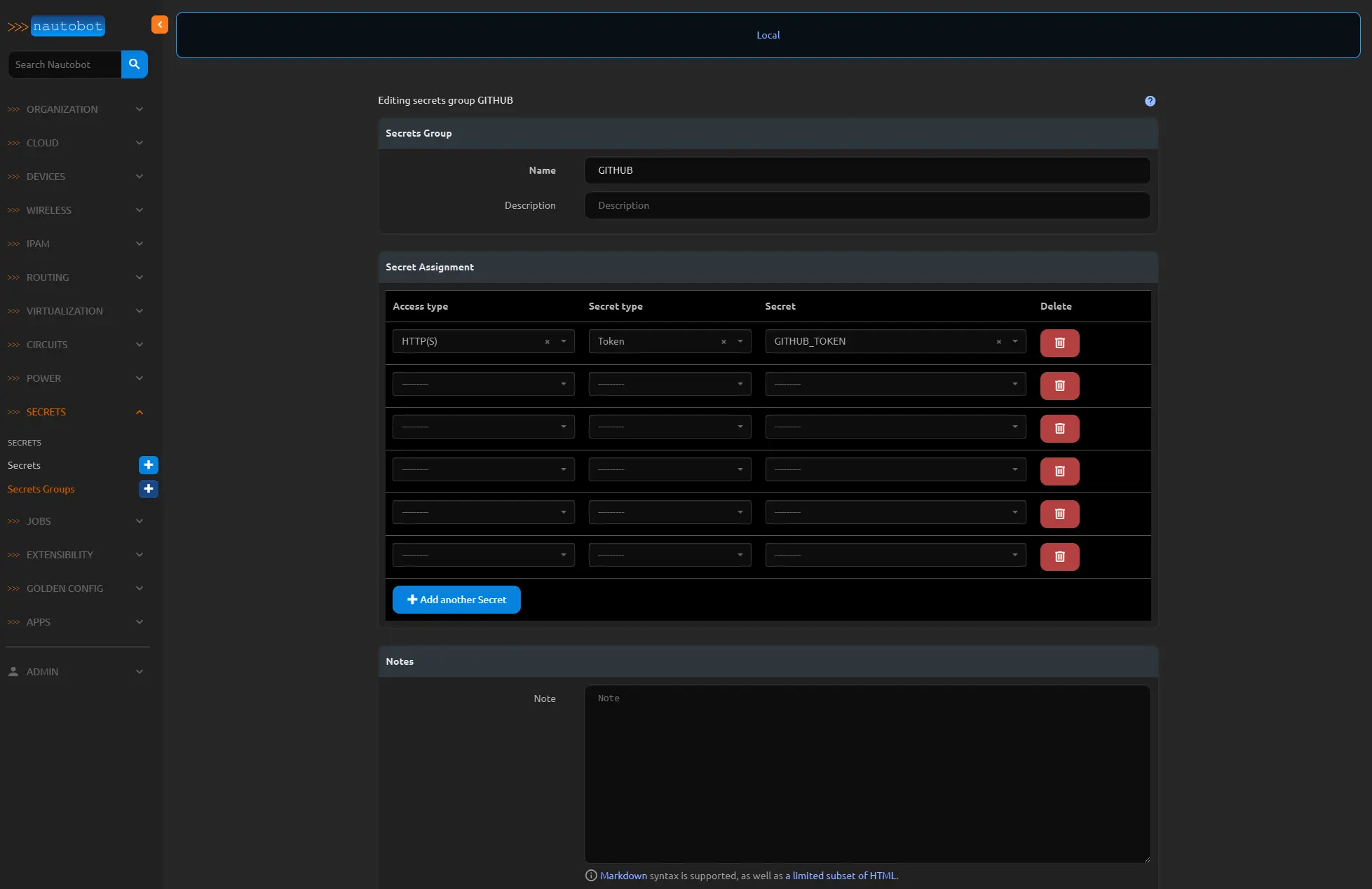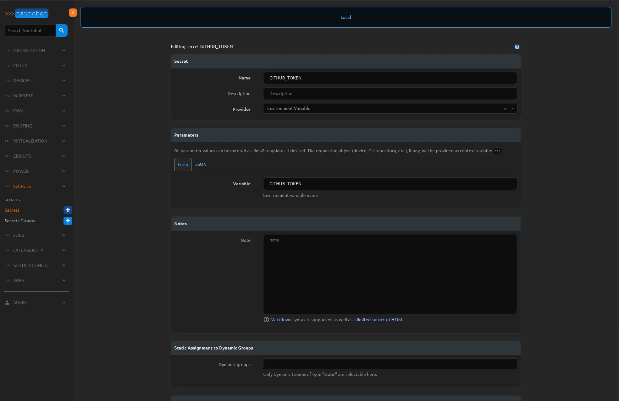 In your Nautobot GUI you will need to create a new secret under SECRETS category. Create a new secret and name it βGITHUB_TOKENβ. The Provider should be Environment Variable, and variable should be exactly what you placed in your creds.env file.
