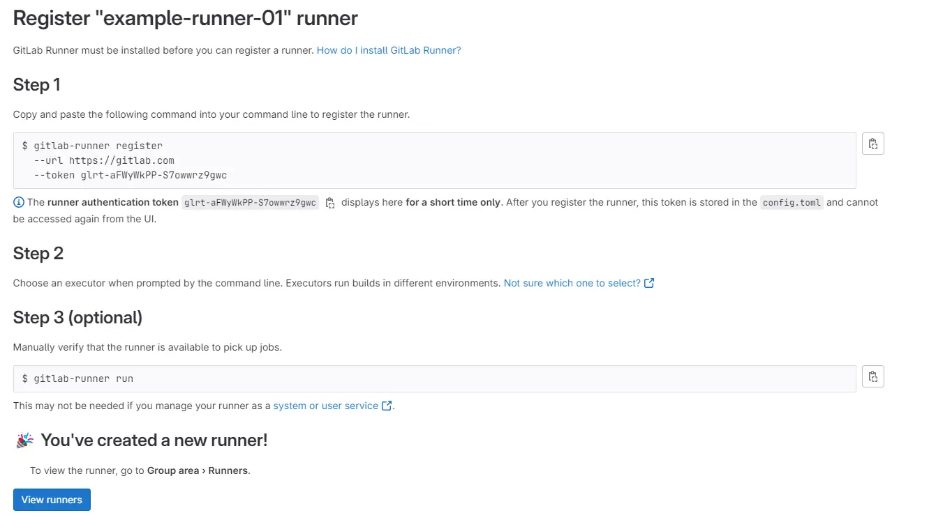 In the shell we need to run a few commands to allow this runner to communicate with our Gitlab group runner.