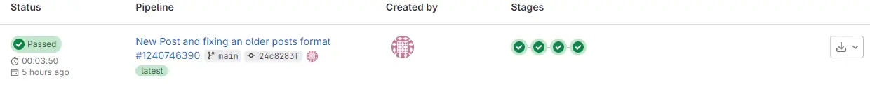 We are ready to test this pipeline out. Add a post to your _posts folder and commit it to your repository. Go to the Gitlab project –> Build –> pipelines. After your commit and sync you should see Gitlab start a new pipeline and go through the 4 stages outlined in Part 1, also to learn more about posts go here.