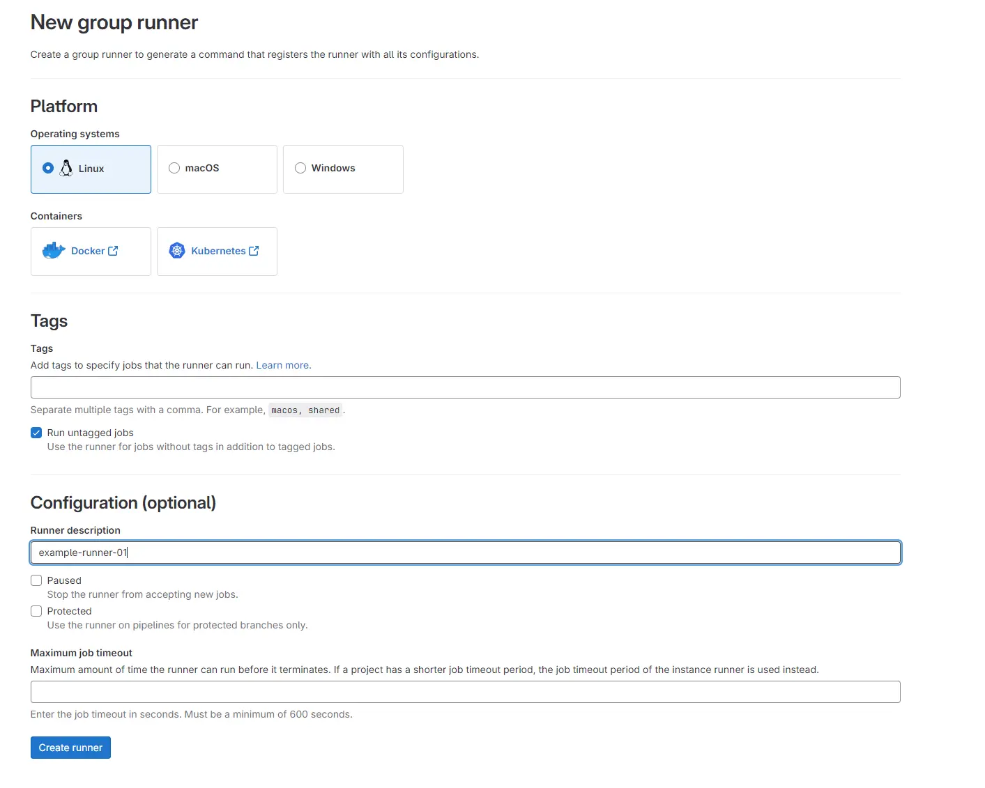 We will be running a linux container in the k3s cluster so leave linux checked, and check run untagged jobs. This runner will run any of the jobs without needed a specific tag. Click the create runner button on the bottom left.