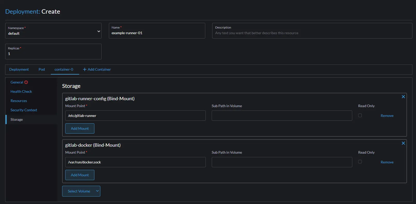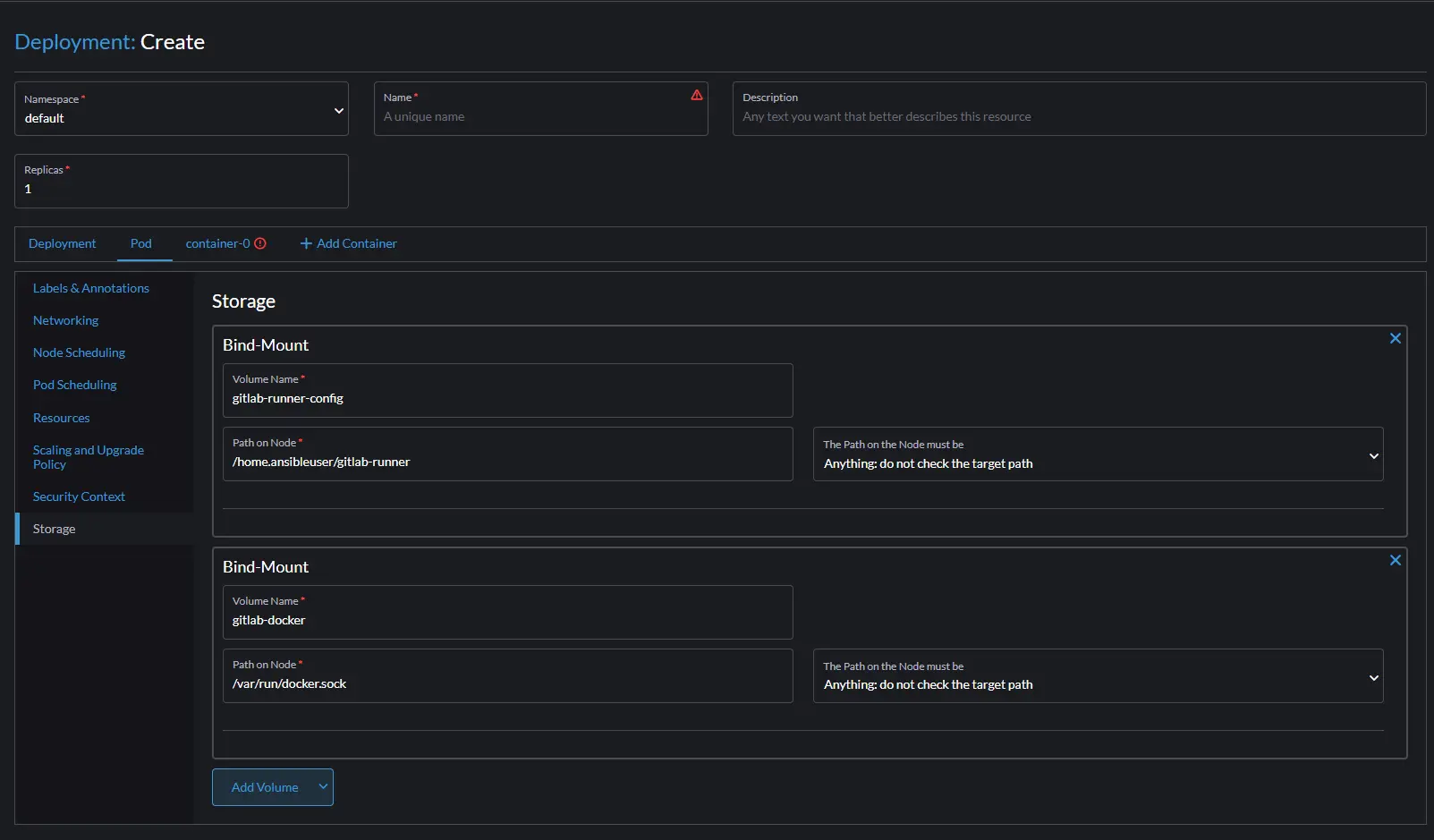 We need to add storage and map these to the local worker host where this workload will land. Click on the Pod and then storage to create the pod storage, click add volume and select bind-mount from the drop down, do this a second time. On the first bind-mount lets call the volume gitlab-runner-config, the path on node will be /home/ansibleuser/gitlab-runner, use whatever the username you used when installing k3s on your worker nodes.