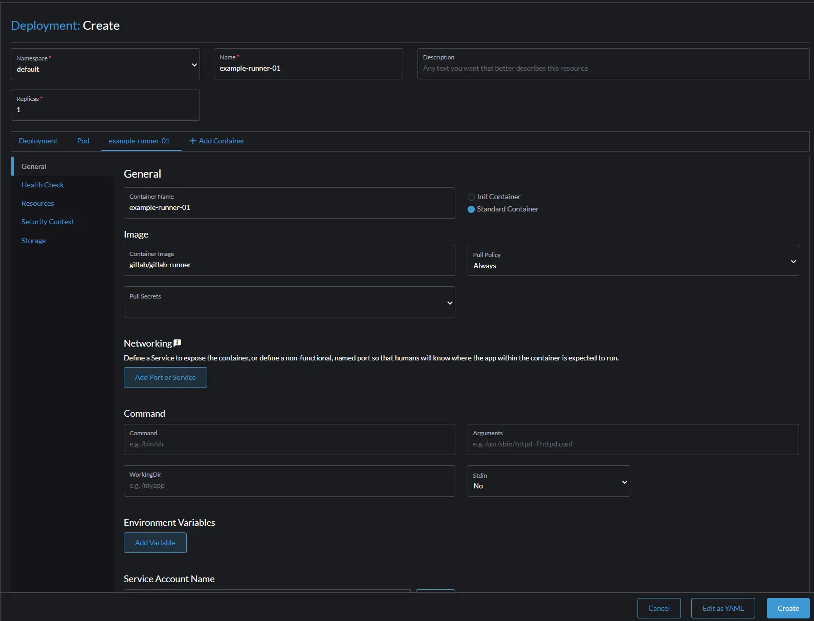 Now that I have the variables setup, we need a Runner to perform the actual deployment and setup a secret to pull down the container from the Gitlab repository.