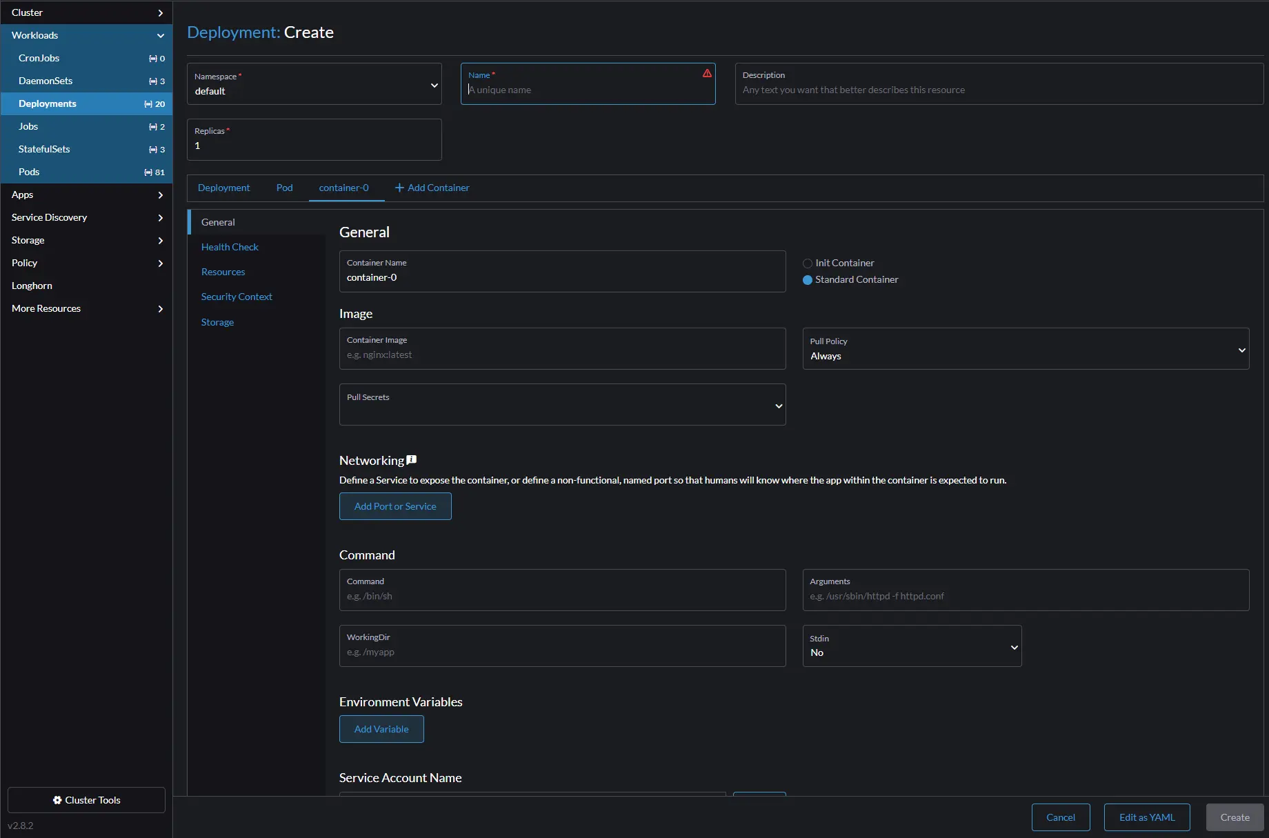 Keep this information and go back to the rancher-ui, click on Workloads –> Deployments and create a new deployment.