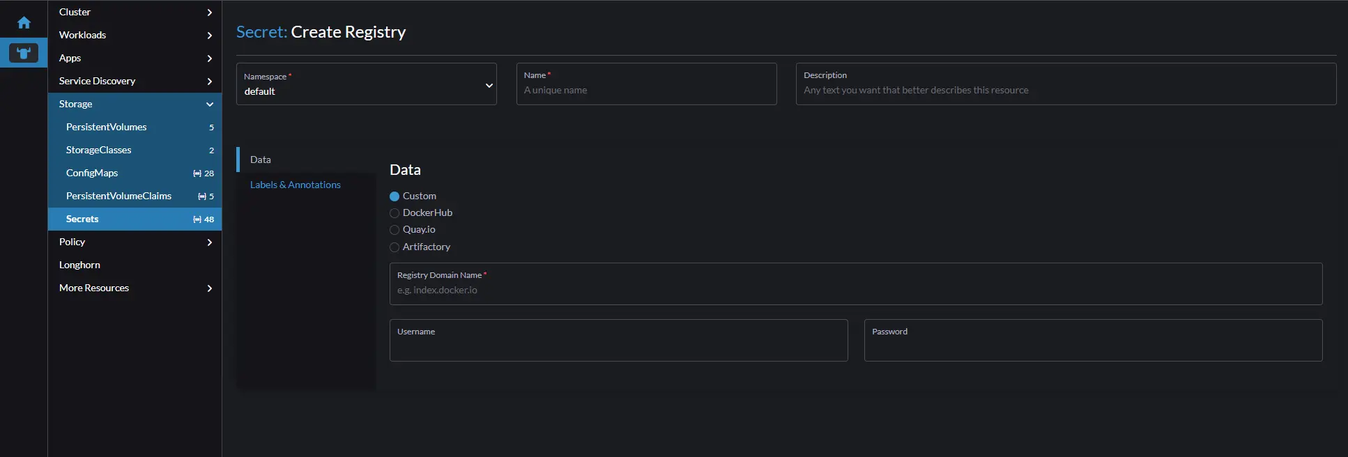First the Kubernetes secret, you can use rancher-ui to set this up navigate to your local cluster –> Storage –> Secrets and create a Registery secret